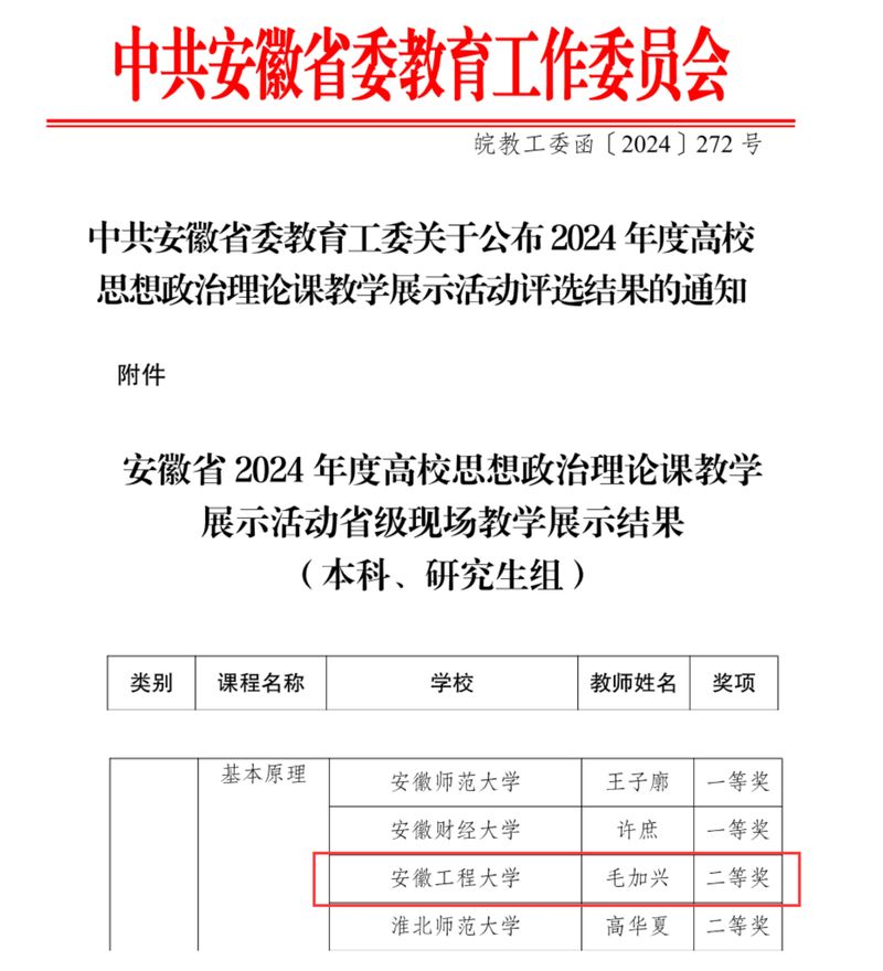 近日,中共安徽省委教育工委、安徽省教育厅公布2024年高校思想政治理论课教学展示活动评选结果,我校马克思主义学院毛加兴老师荣获本科高校《马克思主义基本原理》课程二等奖。
