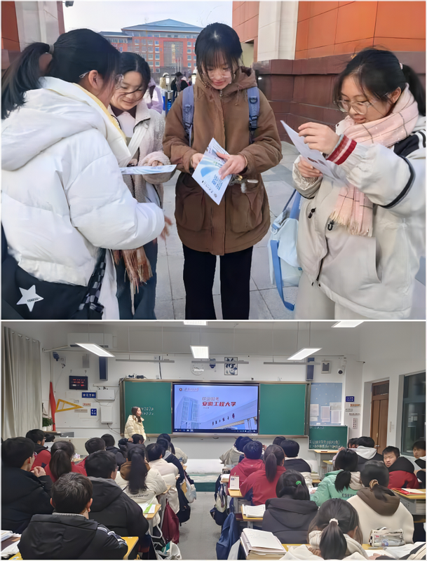 情怀家乡勇攀高峰。学院组织六支招生宣讲团队开展再回母校返家乡招生宣讲活动,其中2023新生郑心愿、吴悦两支团队先后前往六安一中金寨一中。宣传团队运用优美的PPT详细介绍了安徽工程大学优越的招生政策,结合建校88周年宣传片向学弟学妹们介绍了优美校园环境雄厚师资力量。通过这次活动,加深了与高中母校的老师及学弟学妹们的联系,得以重温在高中母校的时光,分享自己的备考经验,用自己的优异成绩与母校共同成长。
