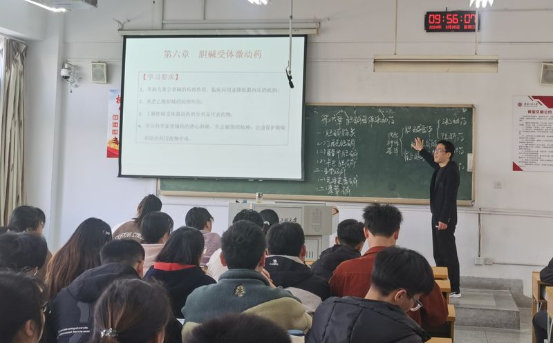 本次课程思政示范课由生物制药专业副教授钱森和老师讲授,课程内容为《药理学》第六章《胆碱受体激动药》。钱老师根据胆碱受体的分类,分别讲解了M受体和N受体激动药的代表性药物——乙酰胆碱、毛果芸香碱和烟碱,在讲解神经递质乙酰胆碱的发现时,融入了张锡钧院士的潜心科研,矢志报国的爱国情怀;在讲到毛果芸香碱缩瞳降低眼内压时,融入了“世界青光眼日”活动,倡议学生要做到守护眼部健康,才能共筑“睛”彩世界;将思政教育元素巧妙的融入到专业知识讲解过程中,做到了“润物无声”的教学育人目的。钱老师备课充分,讲课条理清晰,课中能够与学生积极互动,课堂气氛活跃,教学效果