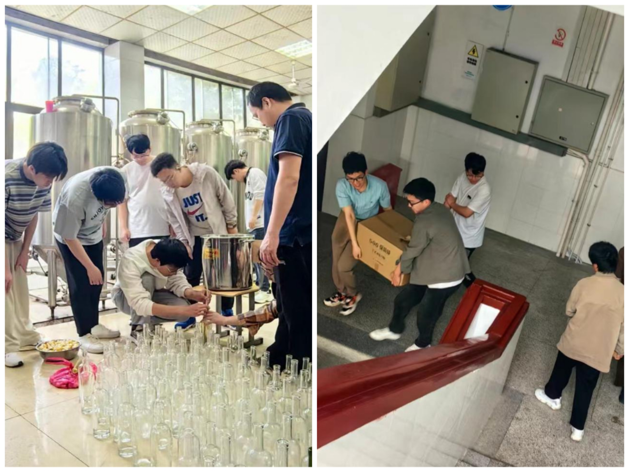 本次劳动教育宣传周特色活动是结合生物工程专业课程,开展的葡萄酒的澄清过滤灌装劳动实践活动。活动分为三个环节,灌装的准备工作环节,包括红酒瓶的清洗灭菌、控水晾干;发酵原酒澄清过滤工艺环节,包括板框过滤机的组装、清洗、硅藻土混匀、过滤;澄清酒的灌装工艺环节,包括灌装、封瓶塞、灭菌、储存。同学们互相协作,共同体会劳动的乐趣和成就感。生工211夏洁说:劳动是成长的必修课,通过这样的劳动教育实践活动,有助于我们更好地将专业理论知识与实践相结合,在劳动者中锤炼本领、增长才干,真正学起来,勤起来,乐起来。